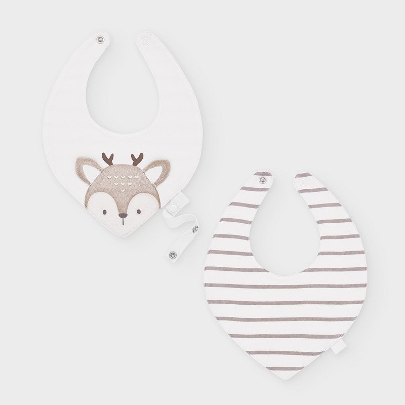 Two pack of baby bibs with original designs. These will be very useful when looking after and feeding your baby. Single snap-button fastening. Made from 100% cotton fabric. Decorative elements: decorative applique. Striped pattern.