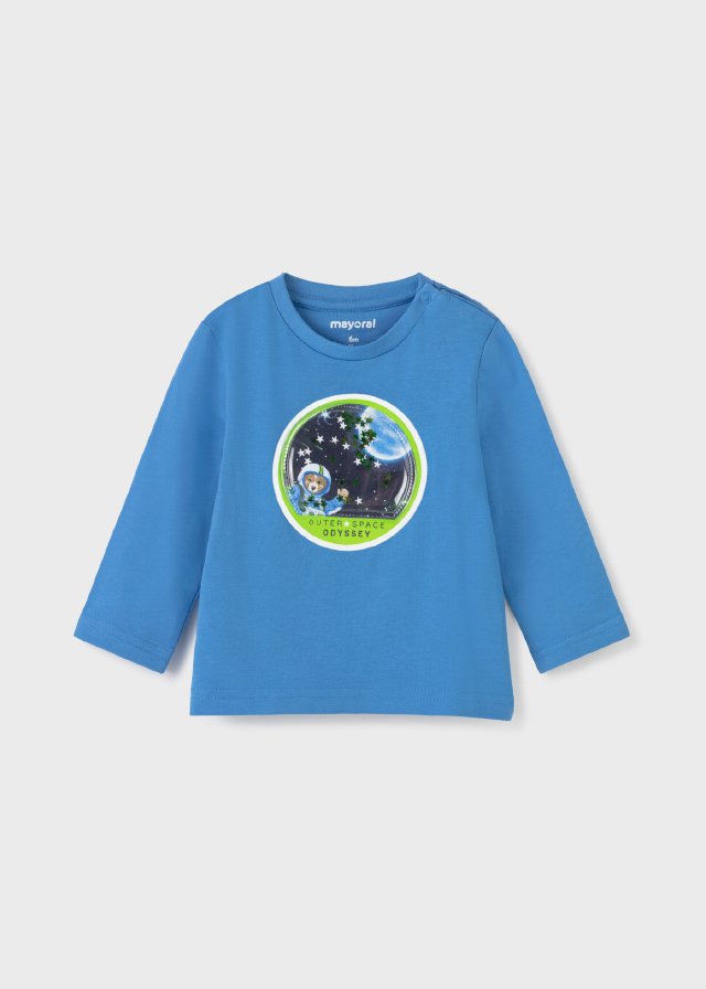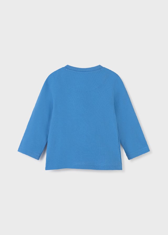 ECOFRIENDS garment 100% sustainable cotton. Long sleeved T-shirt for Baby boy 12 to 36 months. Round neckline. Snap-button fastenings on the shoulder to allow the garment to be put on easily. Made from 100% cotton fabric. Motif PLAY WITH glows in the dark.