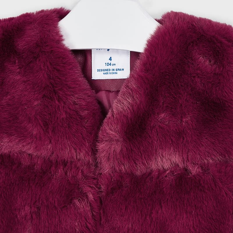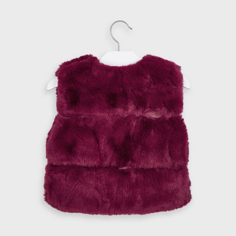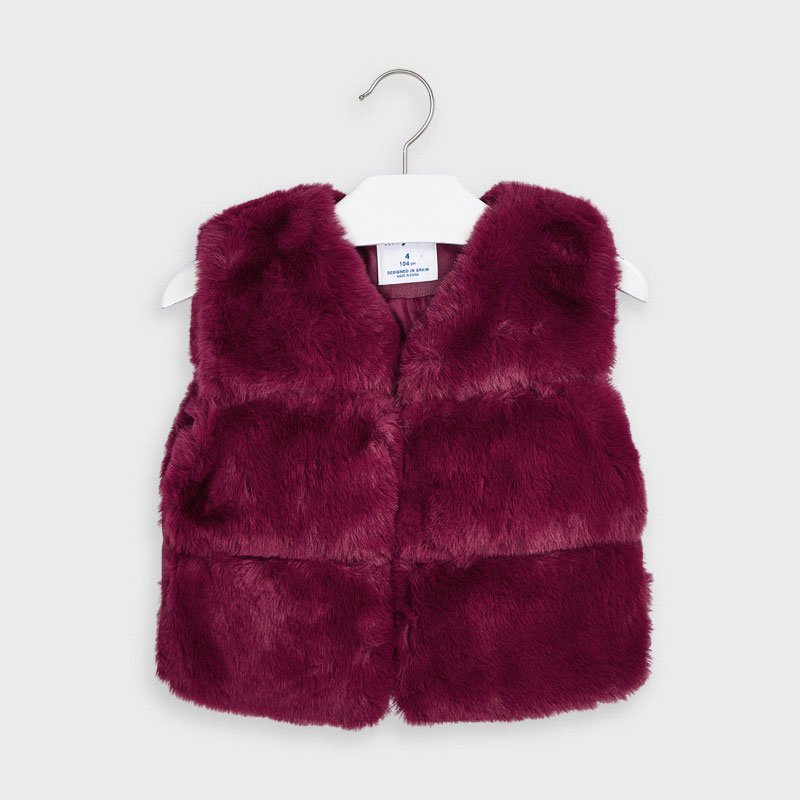 Vest for girl. V-neck design. Fastening with hidden clasps for a quick fit. Soft and smooth outer faux fur fabric.
