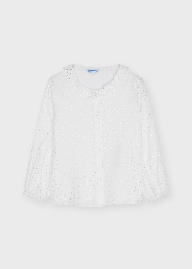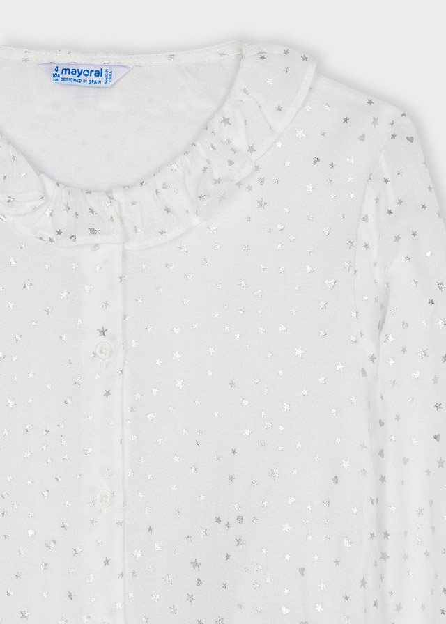 Long sleeved Blouse with elasticated cuffs for Girl 4 to 9 years. Round neckline with ruffles. Straight cut. Button fastenings down the front. Elastic, flowing fabric for maximum comfort on a day to day basis. Patterned design.