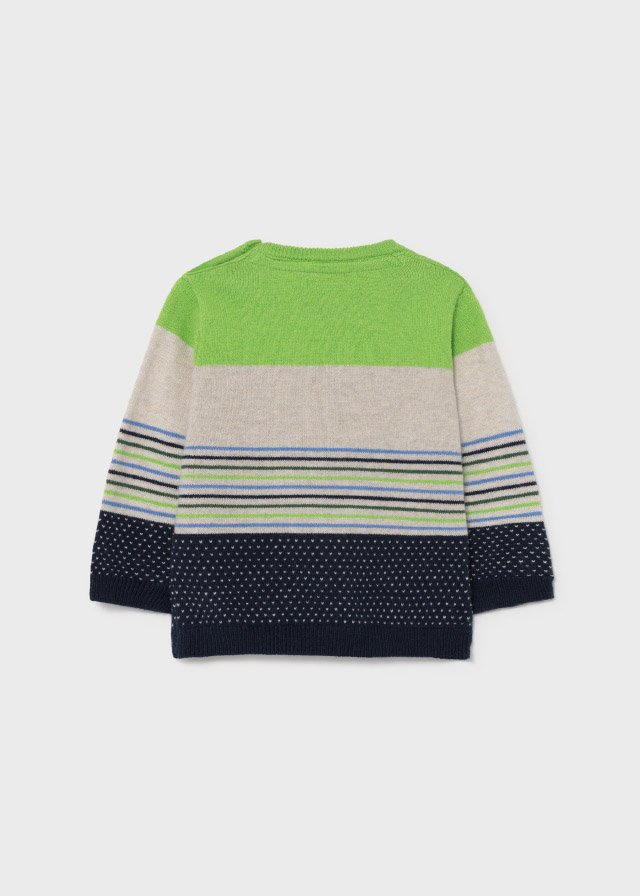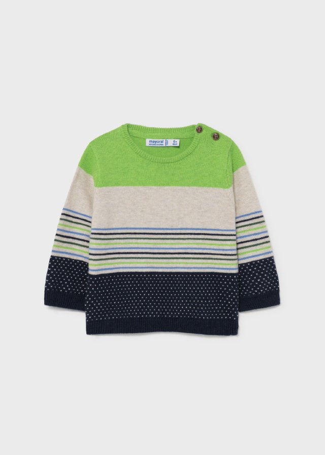 Long sleeved Jumper with elasticated cuffs for Baby boy 12 to 36 months. Round neckline. Buttons fastenings on the shoulder. Striped pattern.