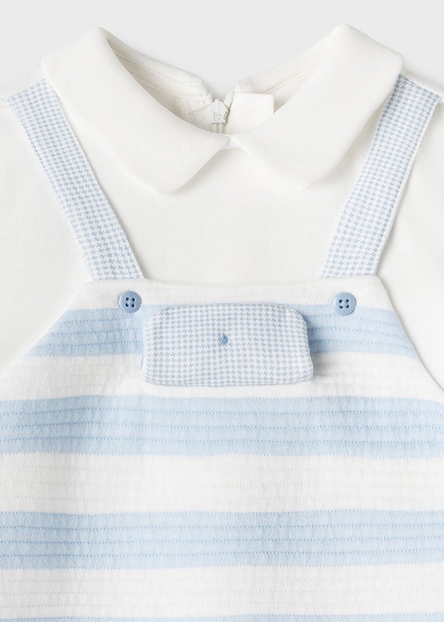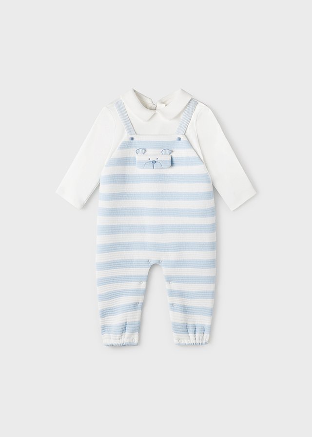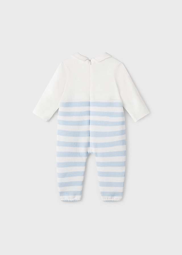 Long sleeved dungarees for Newborn boy 0 to 4 months. Includes feet. Snap-button fastening on the crotch. Zip fastening. Striped pattern.