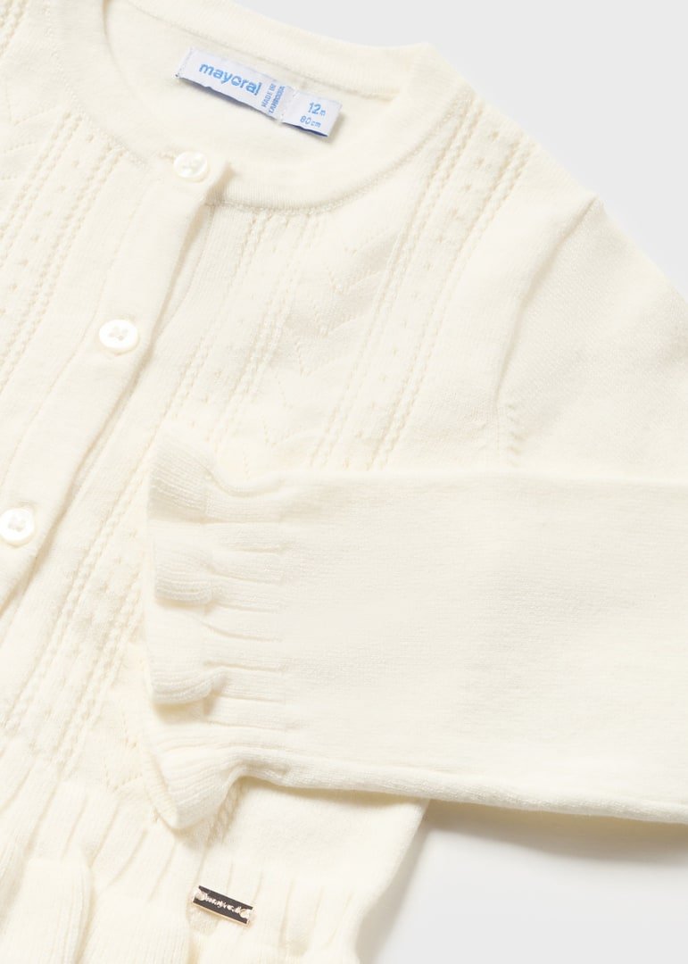 ECOFRIENDS garment, contains sustainable cotton. Long sleeved cardigan for baby. Button fastenings down the front. Made using fine knit fabric that is soft to the touch. Decorative elements: openwork details, decorative ruffle.