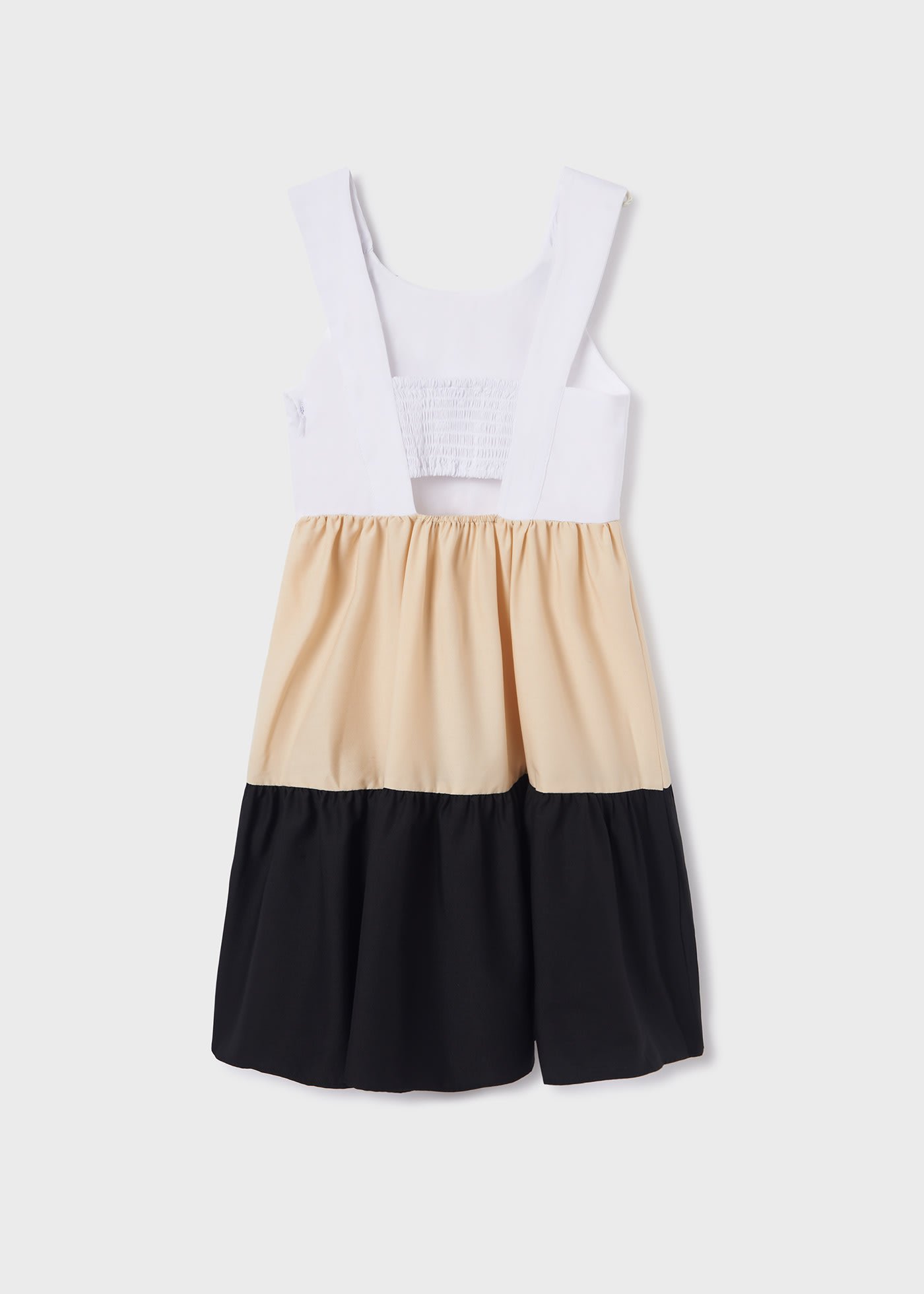 Dress with braces for girl. Round neckline. Invisible zip fastening on the side of the item. Designed with opening on the back.